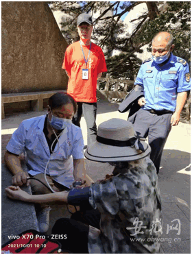 在休憩過程中,李女士低血糖犯了,倍感難受。天柱山工作人員張銳發(fā)現(xiàn)她狀況不對,上前溫馨詢問并熱情帶領(lǐng)她找到景區(qū)醫(yī)療人員,測量血壓,喝了一支葡萄糖。李女士的低血糖得到及時補充,休息一段時間后,精神緩和,體力恢復(fù)。在張銳的陪伴鼓勵下,李女士堅持攀登到天柱山天池峰之巔,親自拍下了雄偉神奇的天柱山主峰影像。