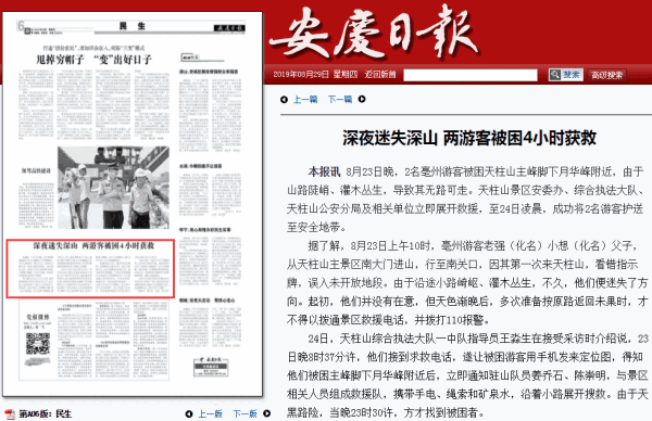 24日,天柱山綜合執(zhí)法大隊(duì)一中隊(duì)指導(dǎo)員王淼生在接受采訪時(shí)介紹說,23日晚8時(shí)37分許,他們接到求救電話,遂讓被困游客用手機(jī)發(fā)來定位圖,得知他們被困主峰腳下月華峰附近后,立即通知駐山隊(duì)員姜喬石、陳崇明,與景區(qū)相關(guān)人員組成救援隊(duì),攜帶手電、繩索和礦泉水,沿著小路展開搜救。由于天黑路險(xiǎn),當(dāng)晚23時(shí)30許,方才找到被困者。