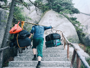 特色: 在天柱山上,經(jīng)常能碰到挑山工。他們肩上搭一根光溜溜的扁擔(dān),兩頭垂下幾根繩子,掛著沉甸甸的物品。登山的時候,他們一只手搭在扁擔(dān)上,另一只手杵著大杵,保持身體平衡。他們的路線是折尺形的--先從臺階的左側(cè)起步,斜行向上,登上七八級臺階,就到了臺的右側(cè);便轉(zhuǎn)過身子,反方向斜行,到了左側(cè)再轉(zhuǎn)回來,每次轉(zhuǎn)身,扁擔(dān)換一次肩。他們這樣曲折向上登,才能使掛在扁擔(dān)前頭的東西不碰...
